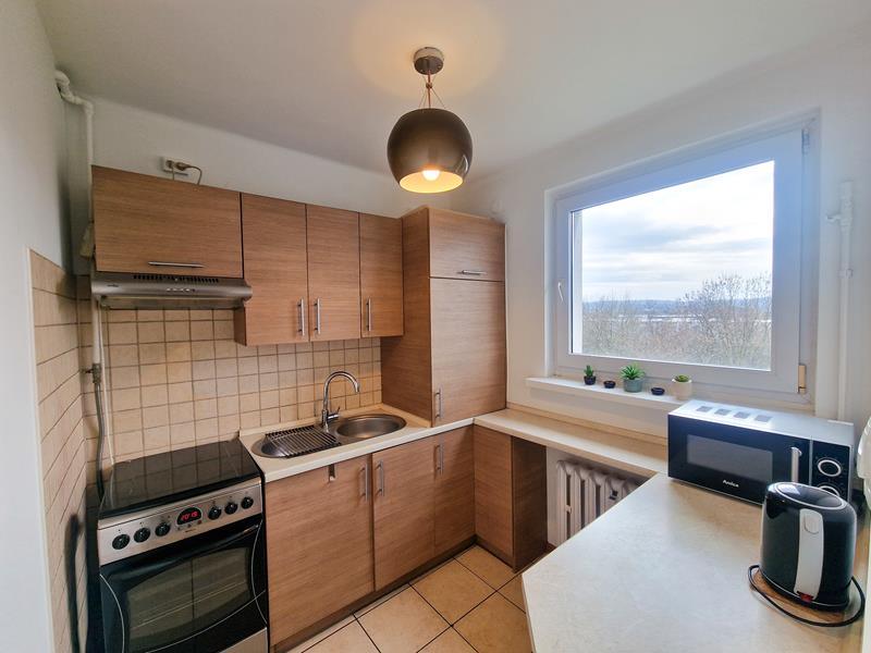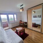 Co do mieszkania…Ta ustawna, a zarazem bardzo funkcjonalna kawalerka składa się z dużego słonecznego salonu, kuchni, łazienki z WC, przedpokoju, balkonu oraz przynależnej piwnicy. W salonie ułożono panele, a kuchnię, łazienkę oraz przedpokój wypłytkowano. Zgrabna kuchnia wynajmowana jest z kompletnymi sprzętami AGD tj.: kuchenką gazową, piekarnikiem elektrycznym, okapem oraz lodówką. W przestronnej (jak na kawalerkę) łazience poza podstawowymi urządzeniami znalazło się miejsce na wannę oraz pralkę. Wszystkie widoczne na zdjęciach meble i sprzęty wliczone są w cenę najmu mieszkania. Okna są tu plastikowe z roletami wewnętrznymi. Ogrzewanie mieszkania – miejskie.